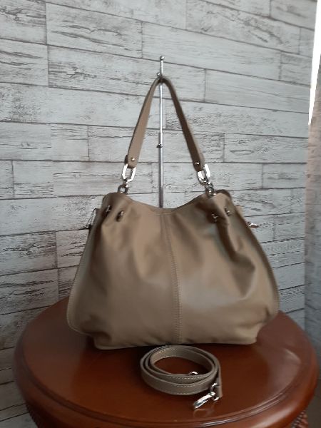 Элегантная женская сумка из натуральной кожи цвета таупе. Две кожаные ручки, предназначенные для ношения сумки на плече, надежно крепятся к фурнитуре под никель. Внутри одно отделение и сумка вкладыш на молнии, которую при желании можно остегнуть и носить отдельно на кожаном ремне. На дне четыре металлических ножки, защищающие сумку от загрязнения и преждевременного протирания.